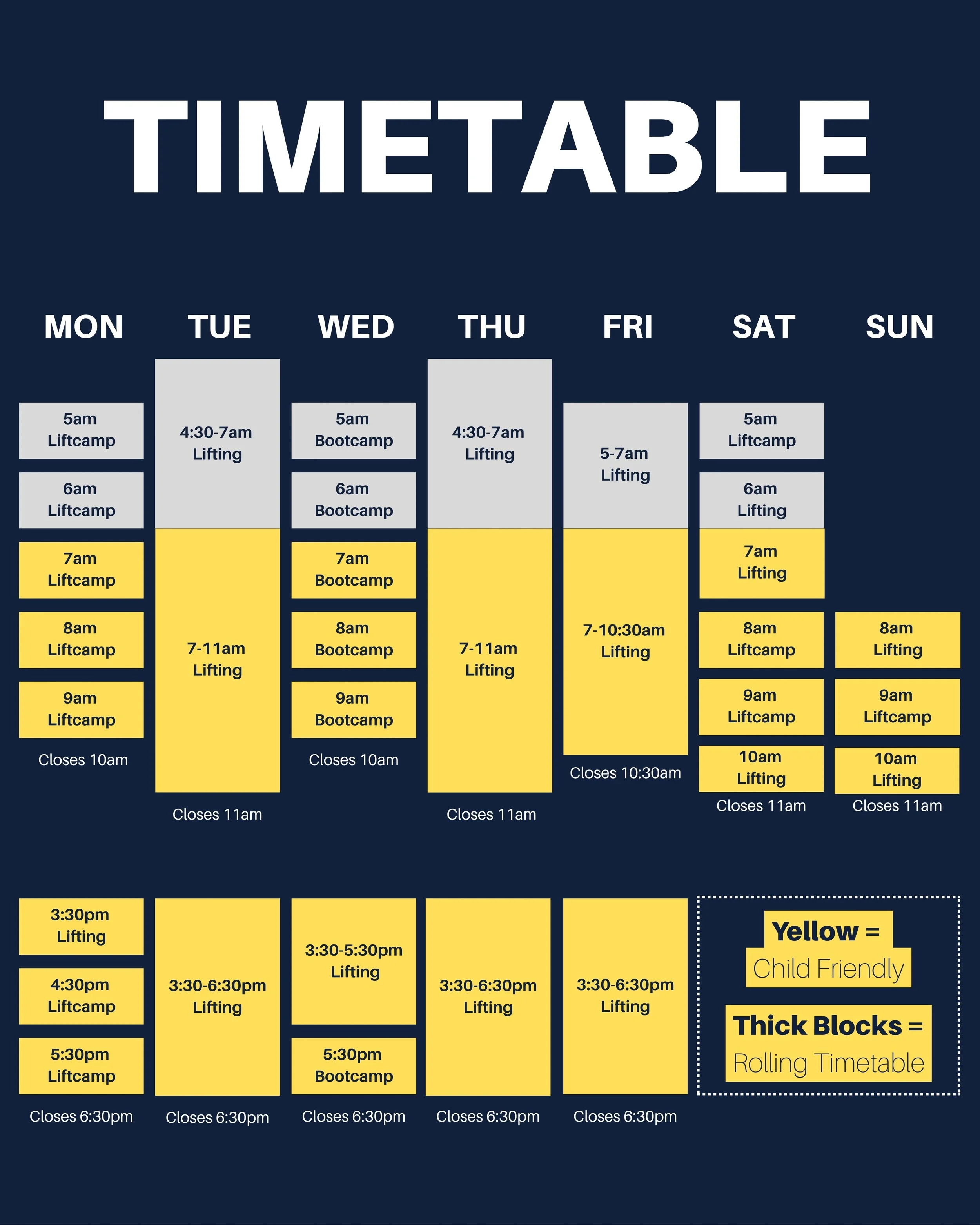 🔁 Rolling timetable on plenty of days to suit busy parents/people and to make sure there’s always time to train on your calendar!
